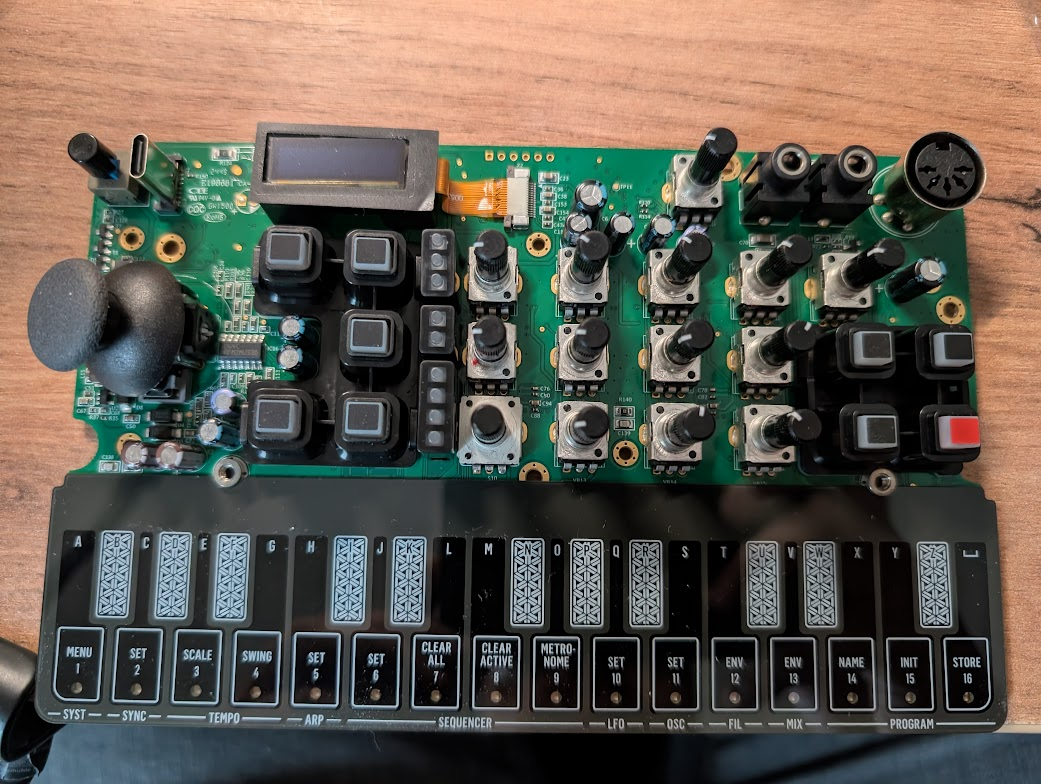 The SMT electronics are all on the backside, while the front side holds the though-hole potentiometers and joystick, as well as the tactile buttons, power button, jacks, joystick and LEDs.
