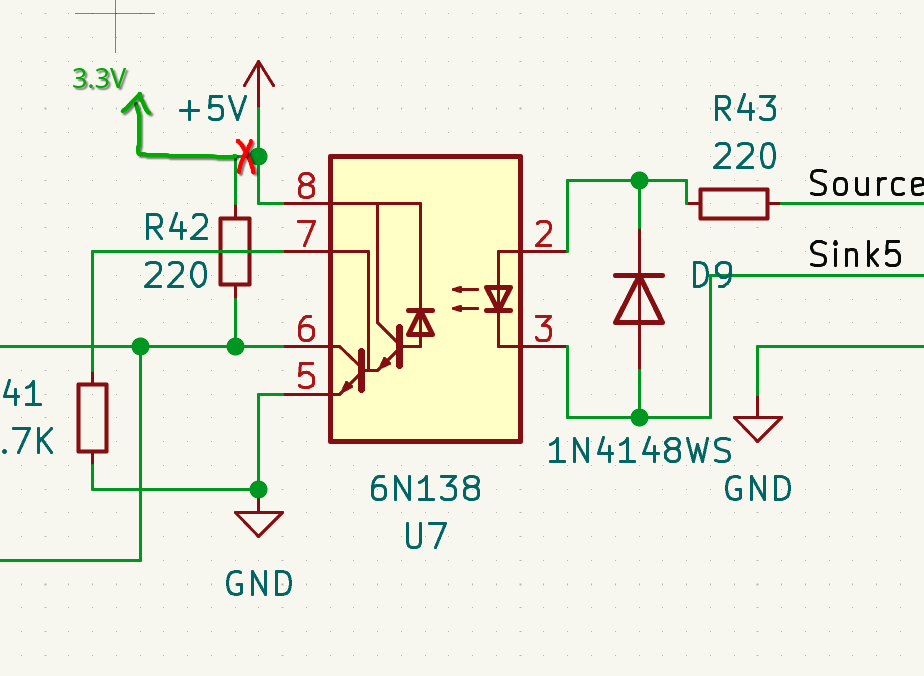 - MIDI IN - wrong optocoupler - I was using a 6N138, which works with 5V. The RP2040’s GPIO pins are not 5V-tolerant (in theory). I severed the track between pin 8 of the optocoupler and R42, and then added a wire between the resistor and 3.3V (I soldered it to the MCP13008’s pin 18). In the next revision, I will be using the H11L1, which works with 3.3V.